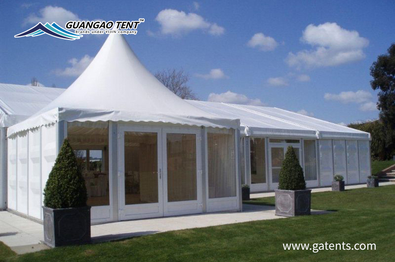 La portée maximale de la tente combinée Guangao est de 65 mètres et la bache sélectionnée est de 850 grammes / mètre carré.La structure interne de la tente présente de solides performances de sécurité, ce qui convient aux mariages, célébrations, fêtes, expositions, banquets, etc. Il présente des avantages fonctionnels et une apparence unique.